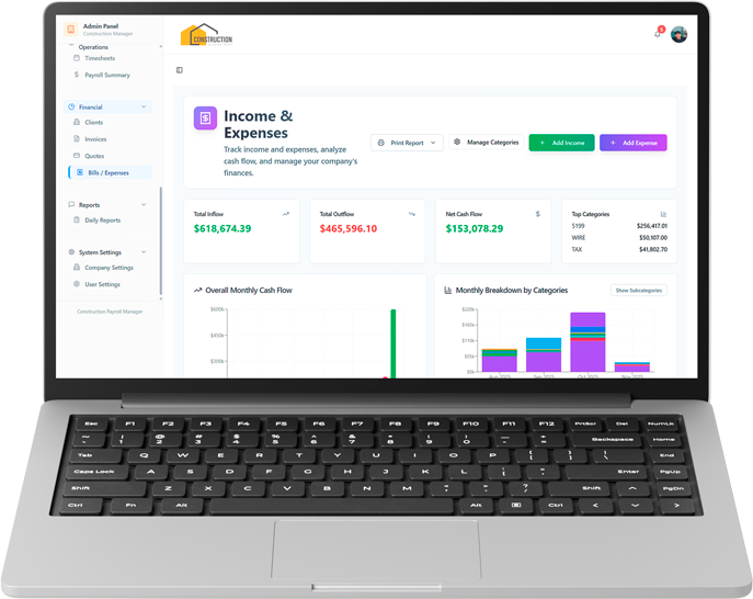 Employees log their daily work hours. The system calculates gross pay based on predefined rates, differentiating between employees and subcontractors. Admins can review and export payroll data anytime.